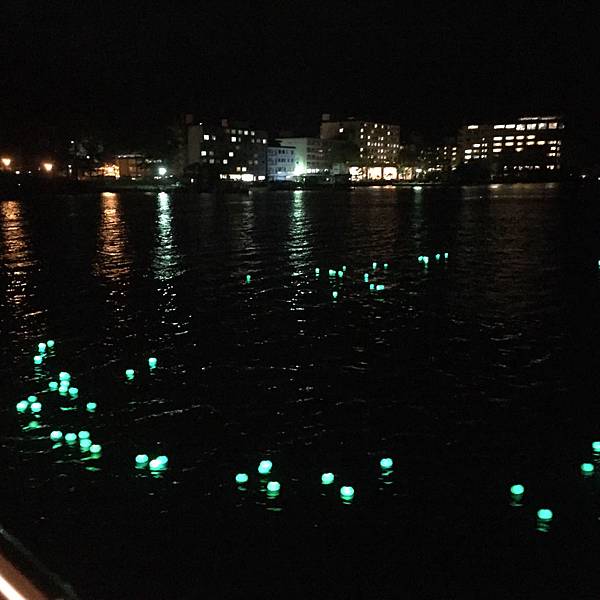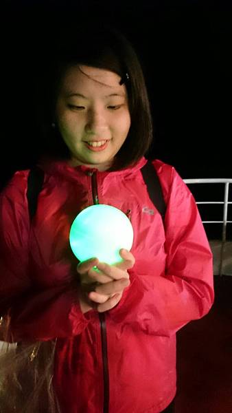 其實就是塑膠然後裡面裝燈,用意是你要把願望寫在紙上然後放進去,接下來大家會在船上統一時間把手上的願望綠藻球放進水裡~